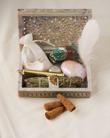 WHAT YOU’RE BURNING: Your kit will feature sustainably harvested Palo Santo incense cones from trees on the coasts of South America, and a richly fragrant, all-natural rosemary wand. Please note that although rosemary smoke lightens the energy of your space and smells amazing, its scent can be strong. Make sure to keep a window or two open during your ritual. Each smoke cleansing kit is packaged with recycled materials and charged with loving intention by a Certified Usui Reiki Master Practitioner. Like all of us, you can expect some flaws. Everything in our Kit (including the hand-carved box) comes from nature where small imperfections signify life, authenticity, and survival.