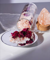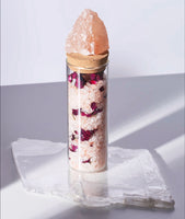 - One vial of high vibe Himalayan salt infused with organic red rose buds and petals housed inside. Glass vial adorned with a Himalayan Salt Crystal