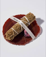 An agate slab and rhodonite crystal accompany the sage to add peaceful and calming energy.